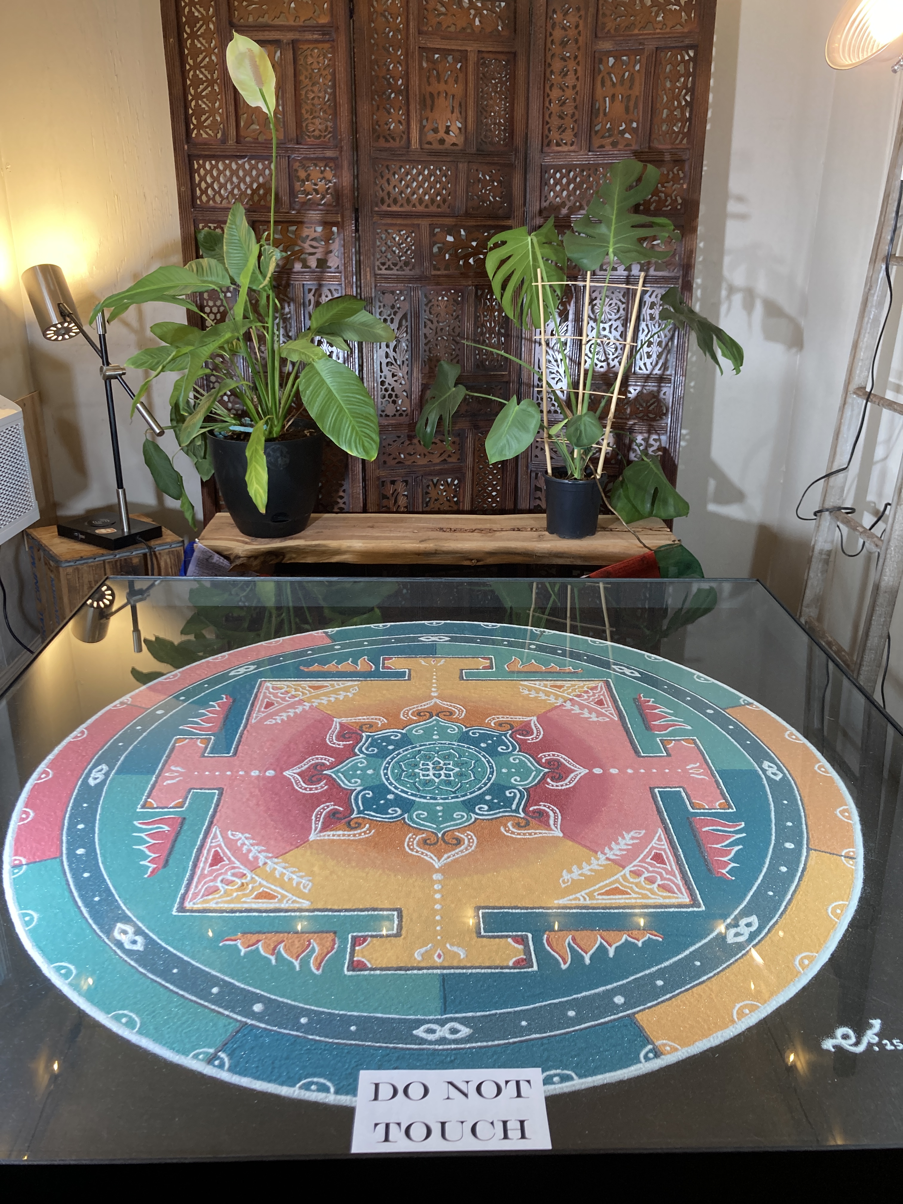 This piece was months in the making, from preparing the sand, washing, drying, sifting and dying it, then 12 days making this sand mandala. It’s a labor of love, that’s for sure.
